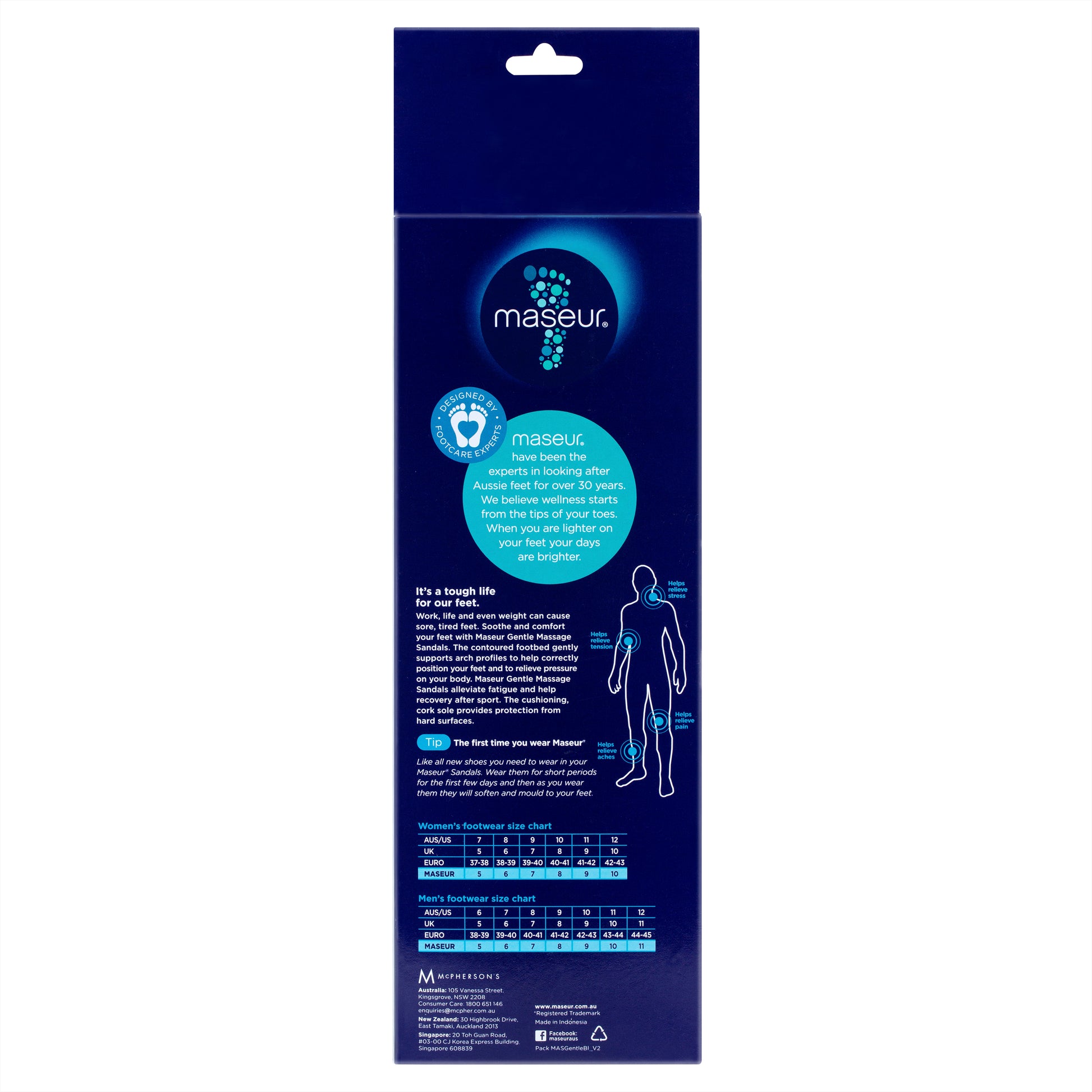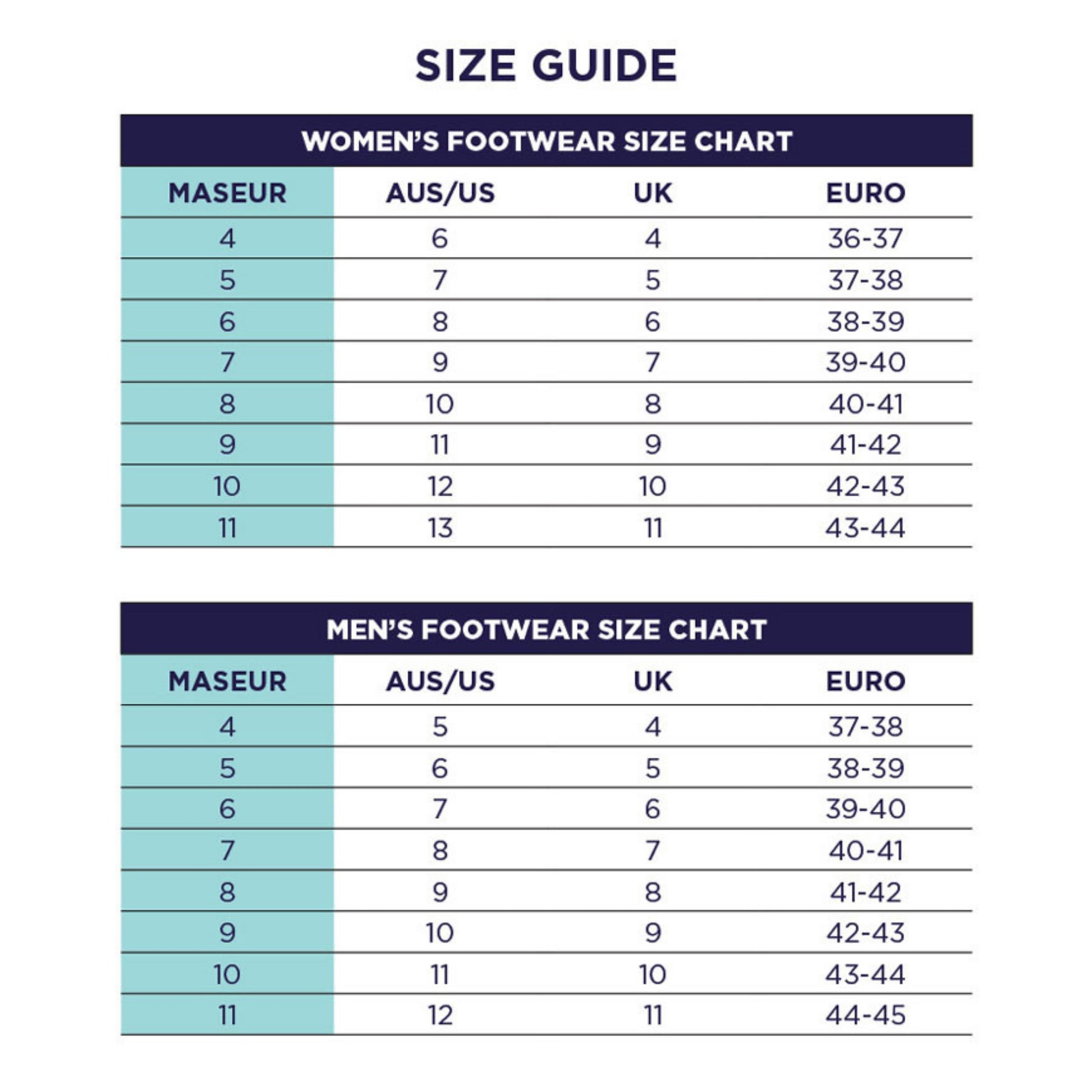 Maseur sandal sizing differs from standard shoe sizes. Please carefully check the size guide before ordering. Size 5 maseurs® are equivalent to a Women's AU size 7 and a Men's AU size 6.