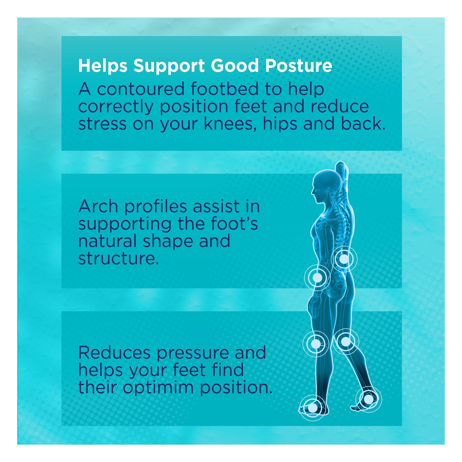 - A contoured footbed to help correctly position feet and reduce stress on knees, hips and back.